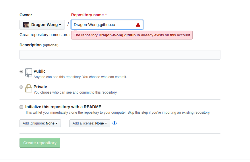 现在假设你已经有一个 Gtihub 账号,你还需要一个特别的仓库,特别在仓库名就是你的 Github 账号登录名,比如我的用户名是:Dragon-Wong,那我要创建的仓库名字完整滴填写是:Dragon-Wong.github.io,具体效果如下图。