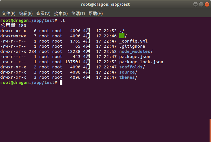现在假设我要创建一个名为 hexo 的项目,项目目录就放在:/app 目录下,所以我们在 /app 目录下创建一个 hexo 目录。现在这个项目的全路径是:/app/test